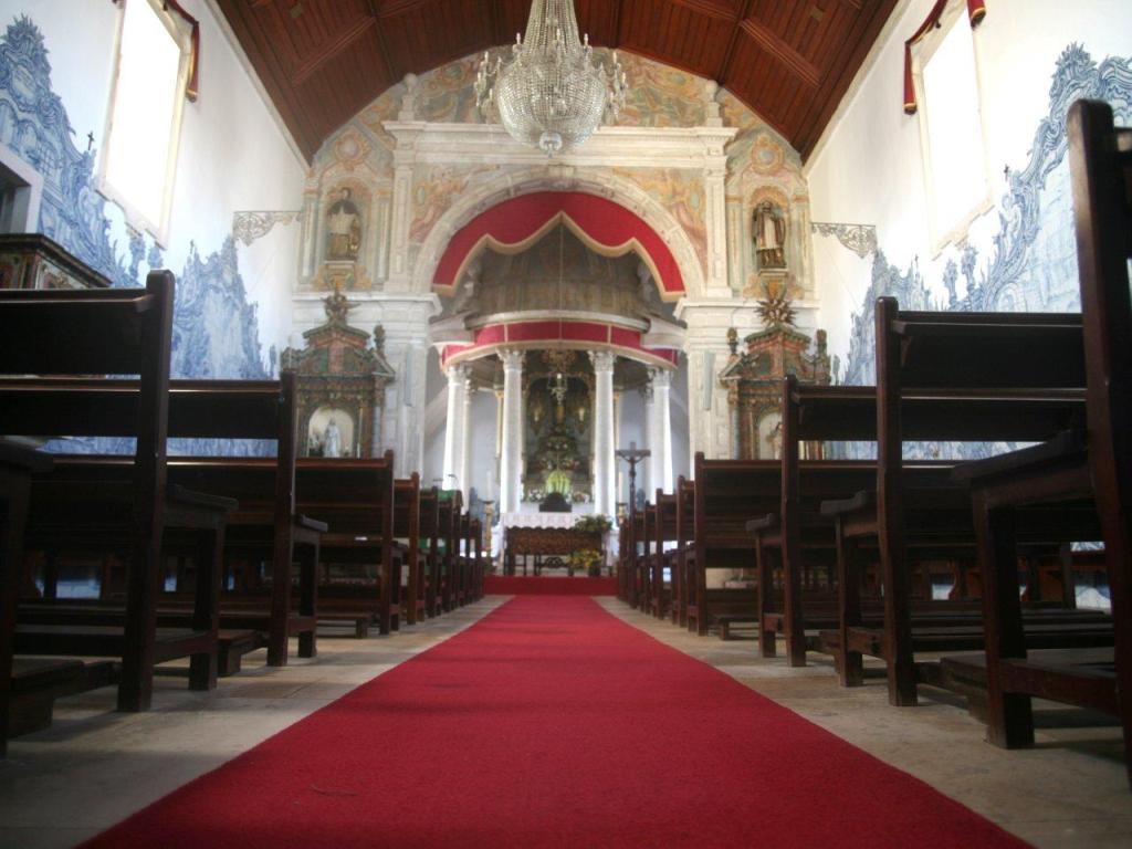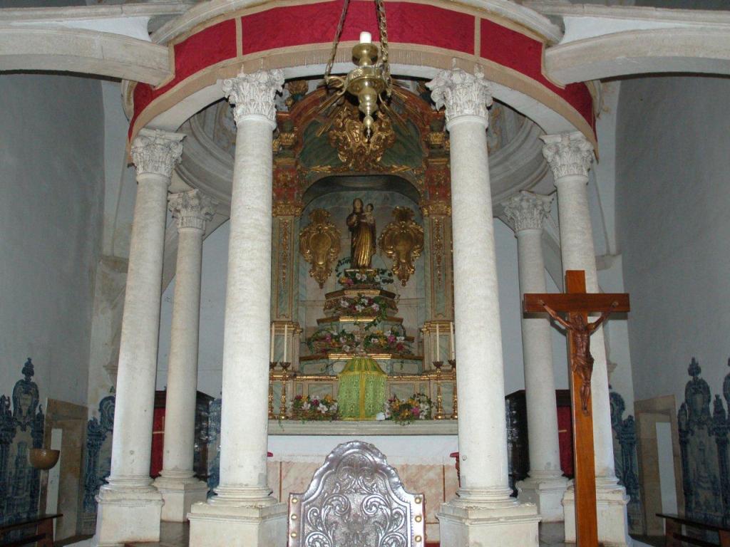 The main façade is delimited by pilasters in the wall-piers, surmounted by pinnacles and opened by a woven portal with a cornice connected to the big window of the choir and, in the gable, an oculus. Inside the church, the aisle is covered by 10 blue and white tile panels, from about 1750.