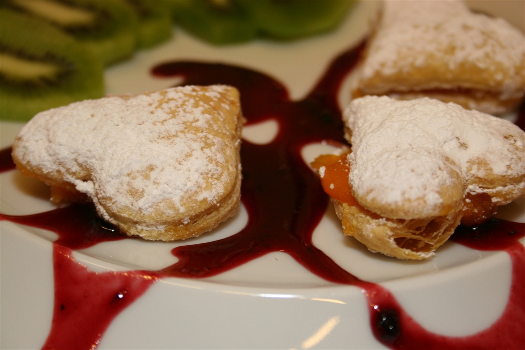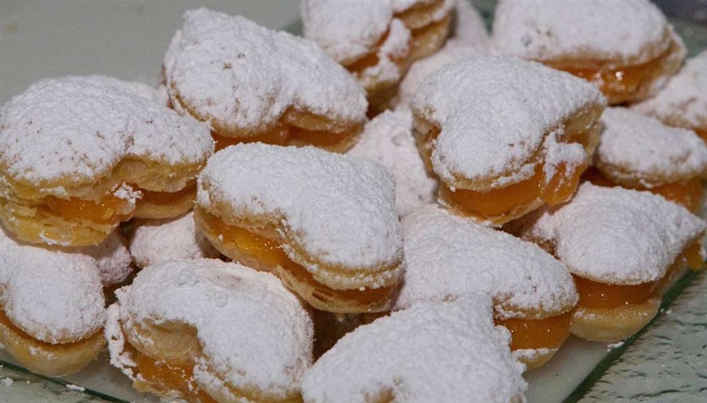 Originalmente de forma quadrada, são pasteis de uma massa folhada muito fina recheada de ovos moles e polvilhados com açucar pilé, actualmente apresentados em forma de coração.