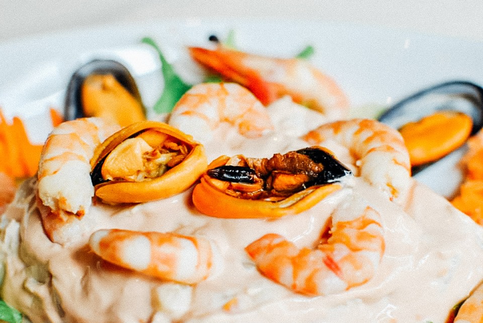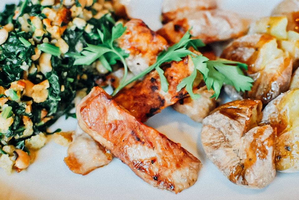 Bacalhau à brás, Secretos de porco preto com batata a murro e migas e Salada do Mar com Gambas e Mexilhão.